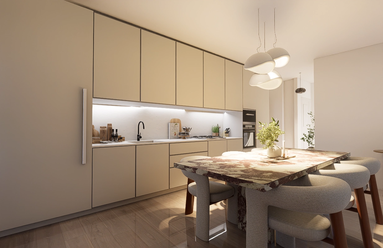 Kuhinja čistih linija i blagovaonski stol naglašenog karaktera postaju središte okupljanja, dok dnevni boravak nudi intimniji ugođaj uz tople svjetlosne scenarije i ugodne volumene.