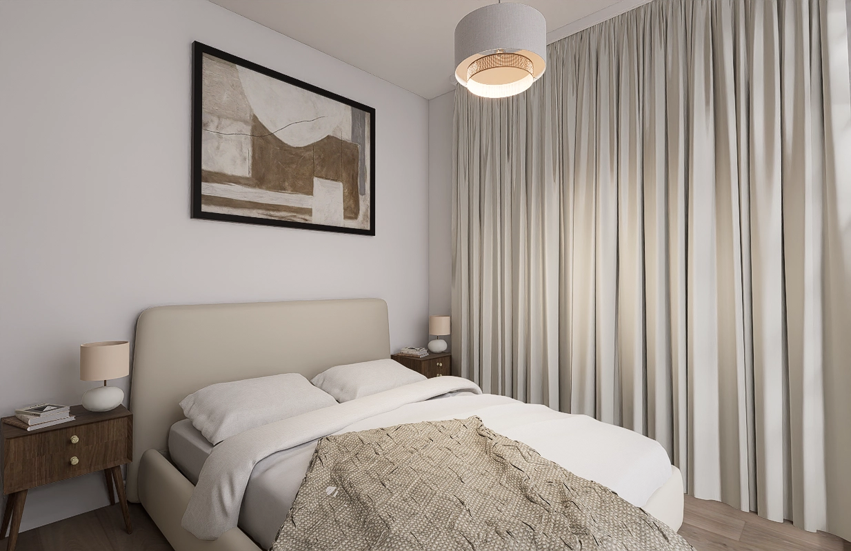 Zavjese, tapecirani elementi i prirodni tonovi dodatno omekšavaju prostor, stvarajući ambijent koji poziva na opuštanje.