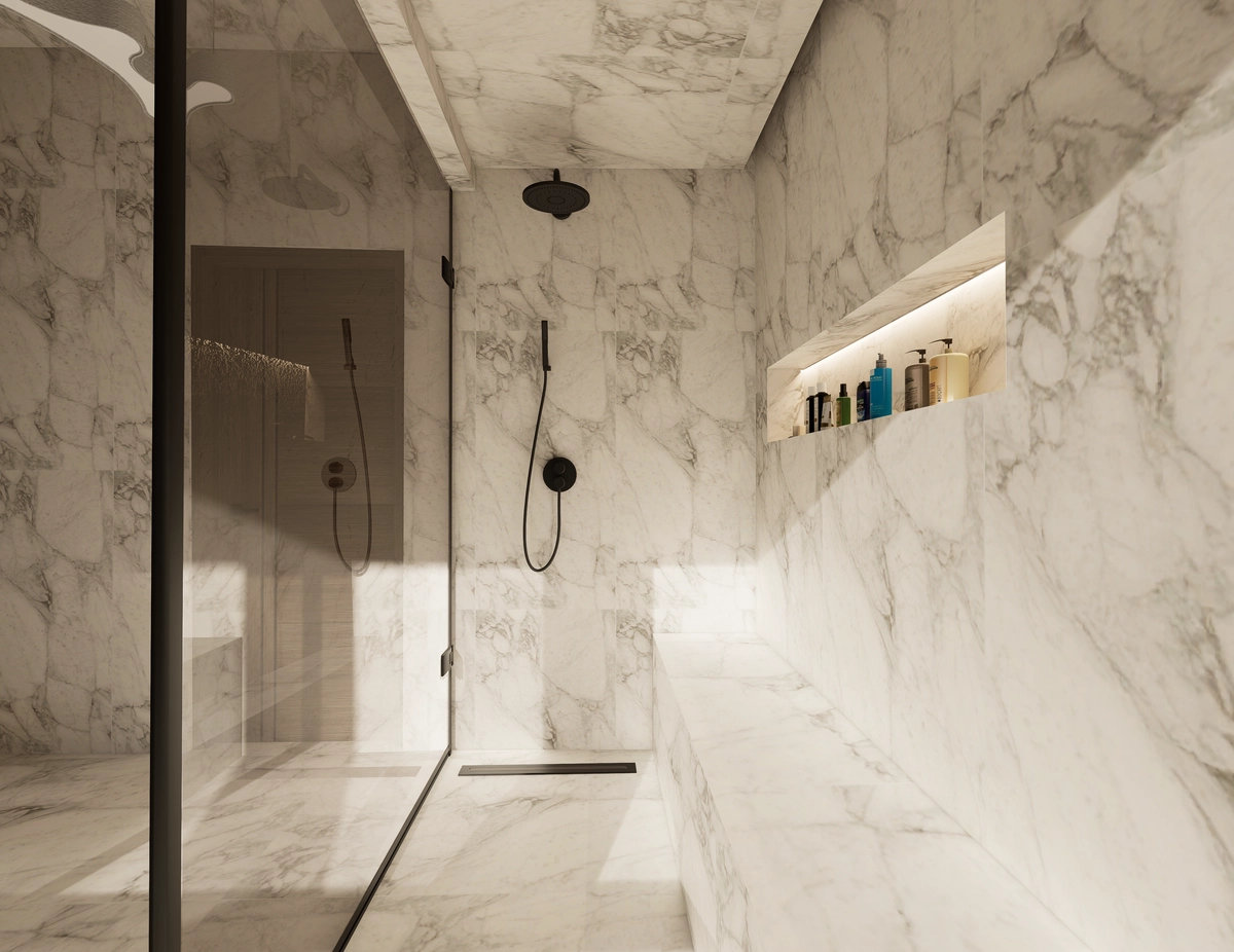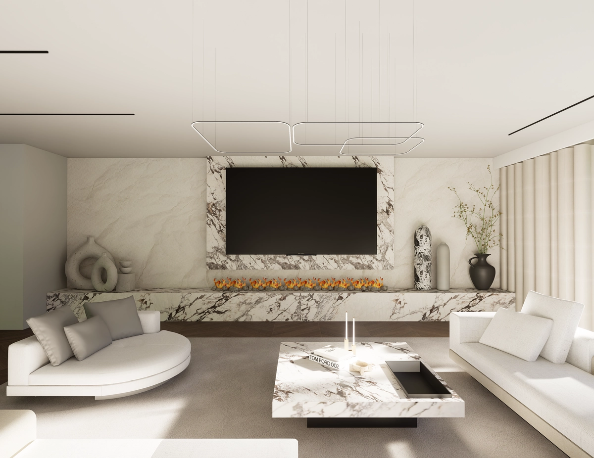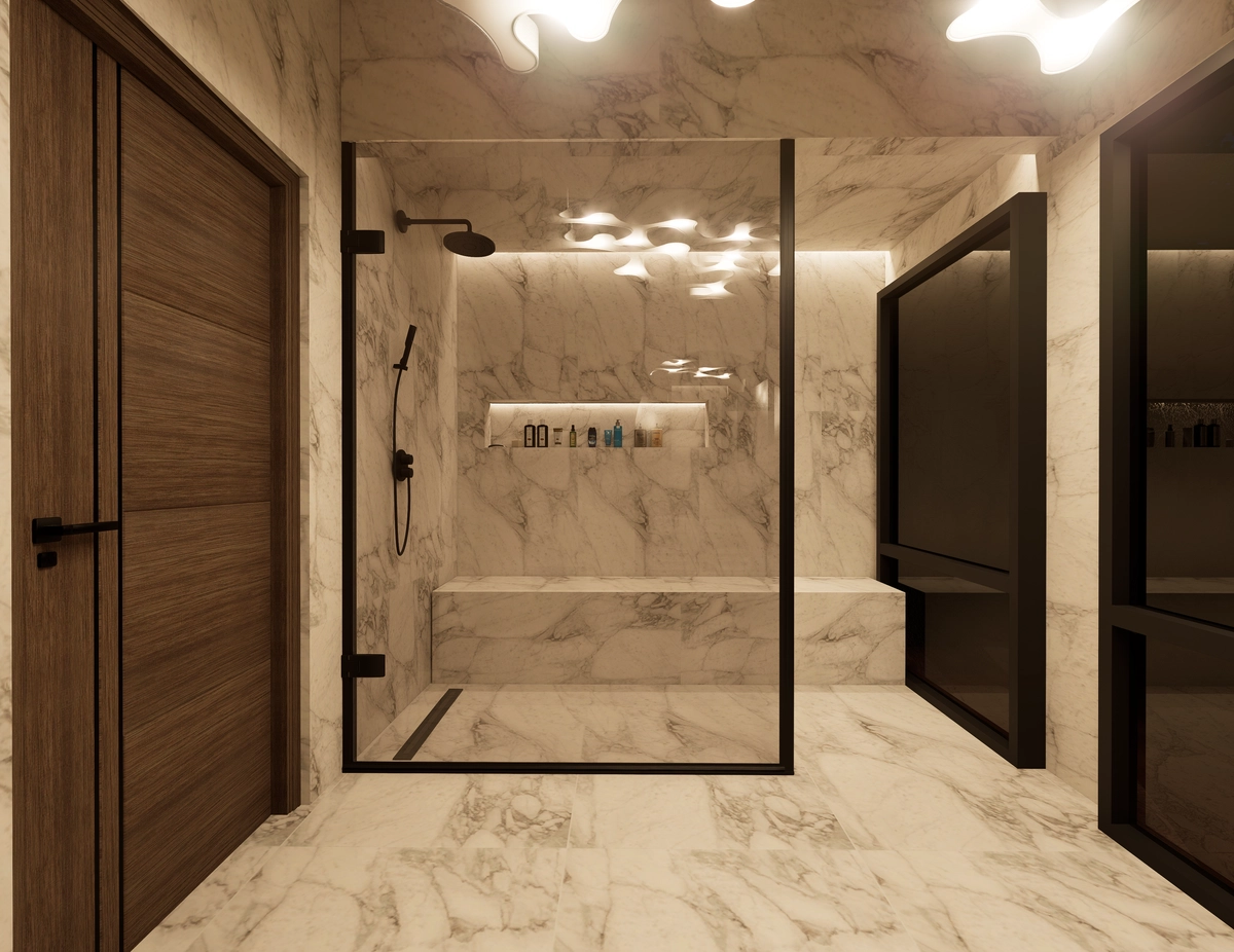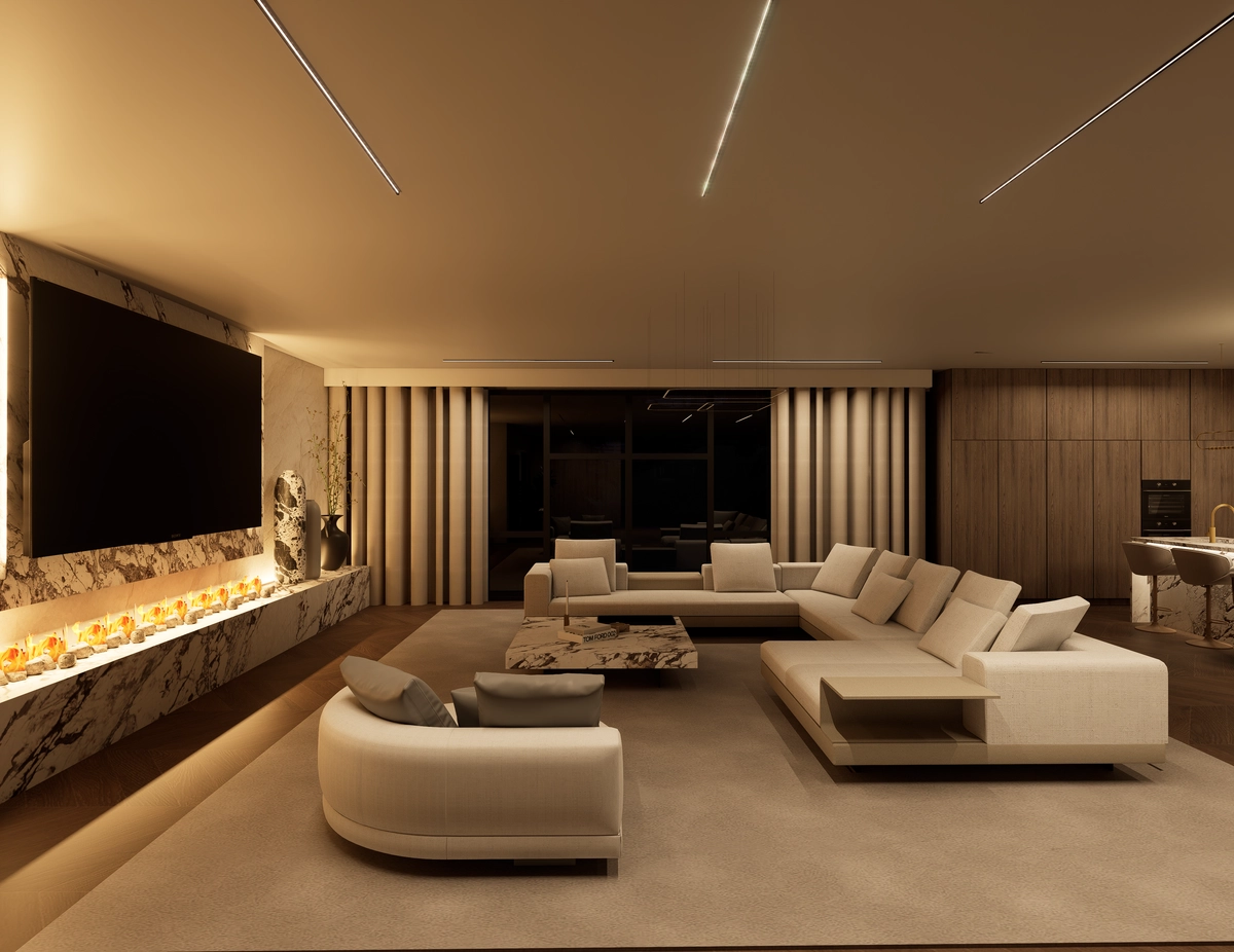 Rasvjeta je oblikovana kao suptilan, ali ključan sloj interijera - kontrolirana i pažljivo pozicionirana, ona naglašava teksture, refleksije i dubinu materijala, dok ujedno definira atmosferu koja se mijenja ovisno o dobu dana i perspektivi. Vertikalni elementi dodatno izdužuju prostor, dajući mu eleganciju i osjećaj prozračnosti.