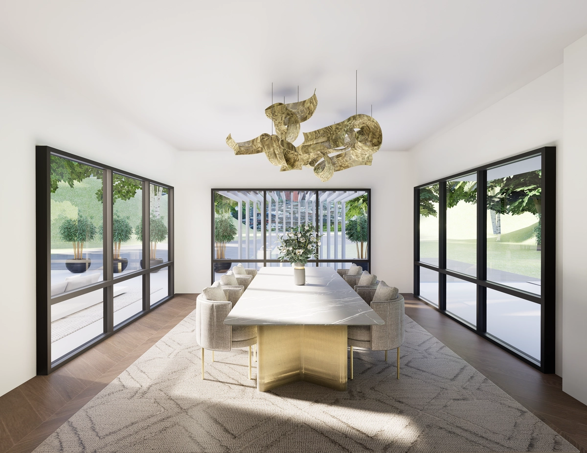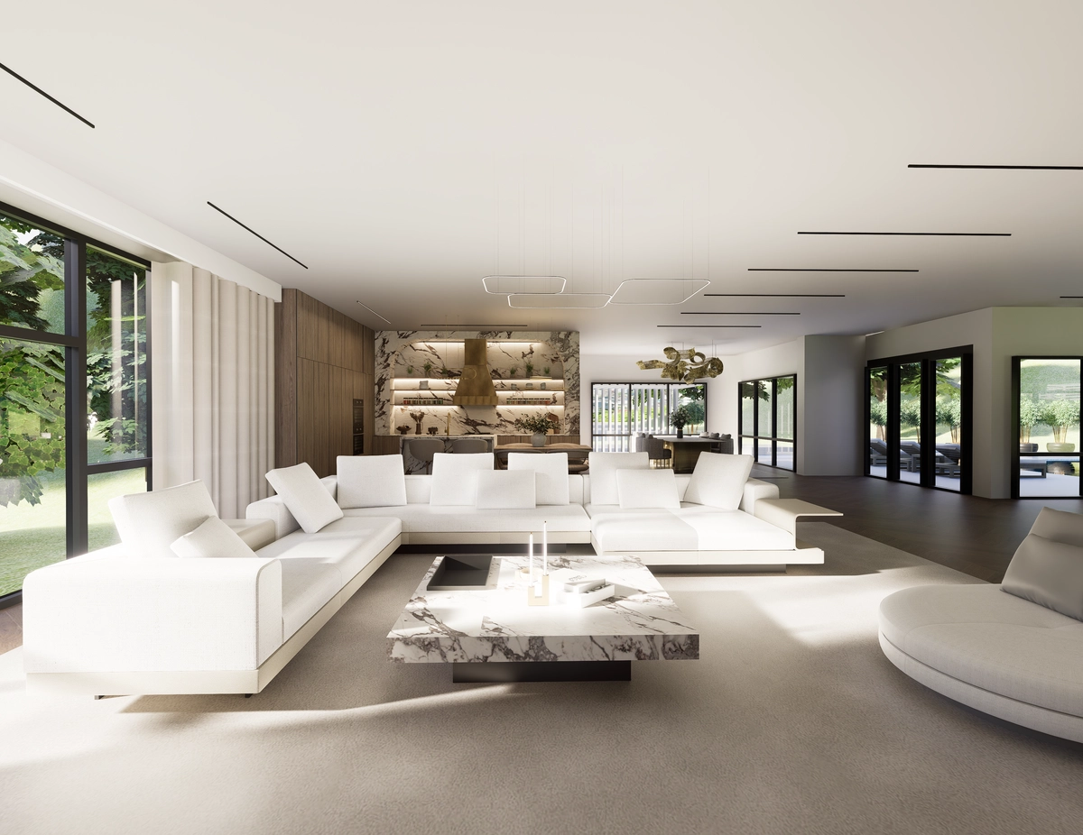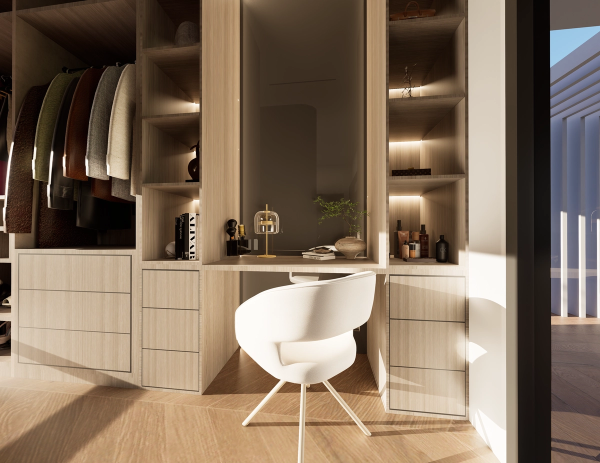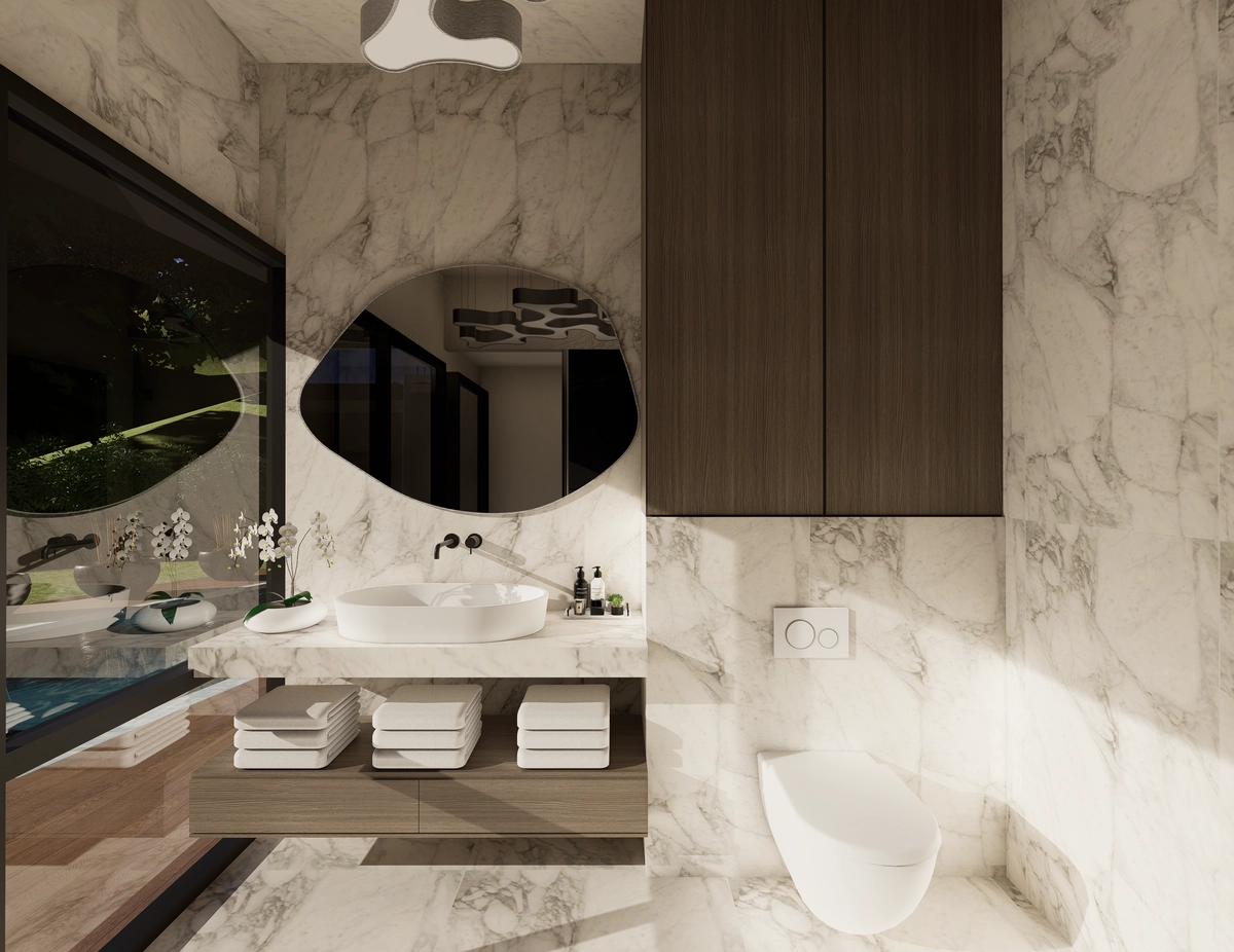 Rasvjeta je oblikovana kao suptilan, ali ključan sloj interijera - kontrolirana i pažljivo pozicionirana, ona naglašava teksture, refleksije i dubinu materijala, dok ujedno definira atmosferu koja se mijenja ovisno o dobu dana i perspektivi. Vertikalni elementi dodatno izdužuju prostor, dajući mu eleganciju i osjećaj prozračnosti.