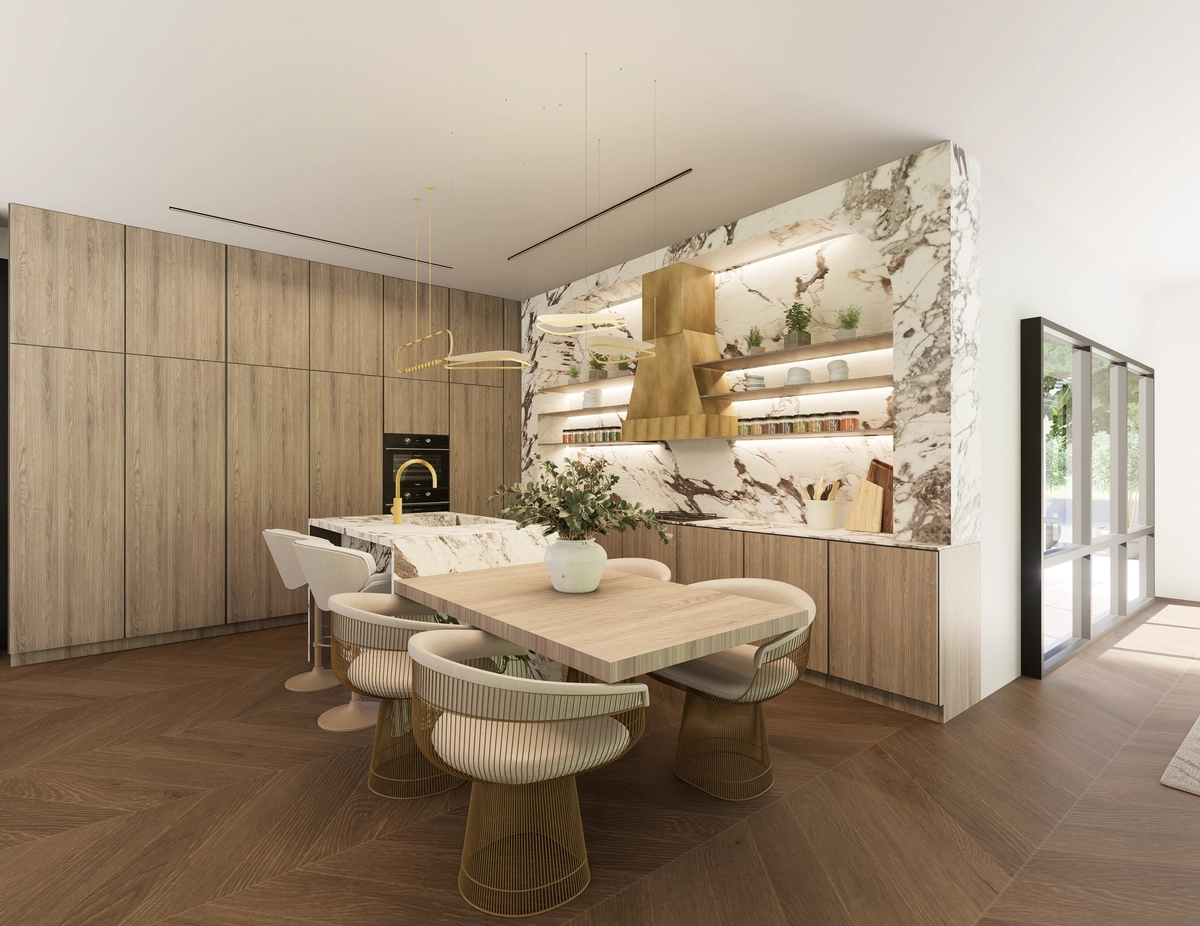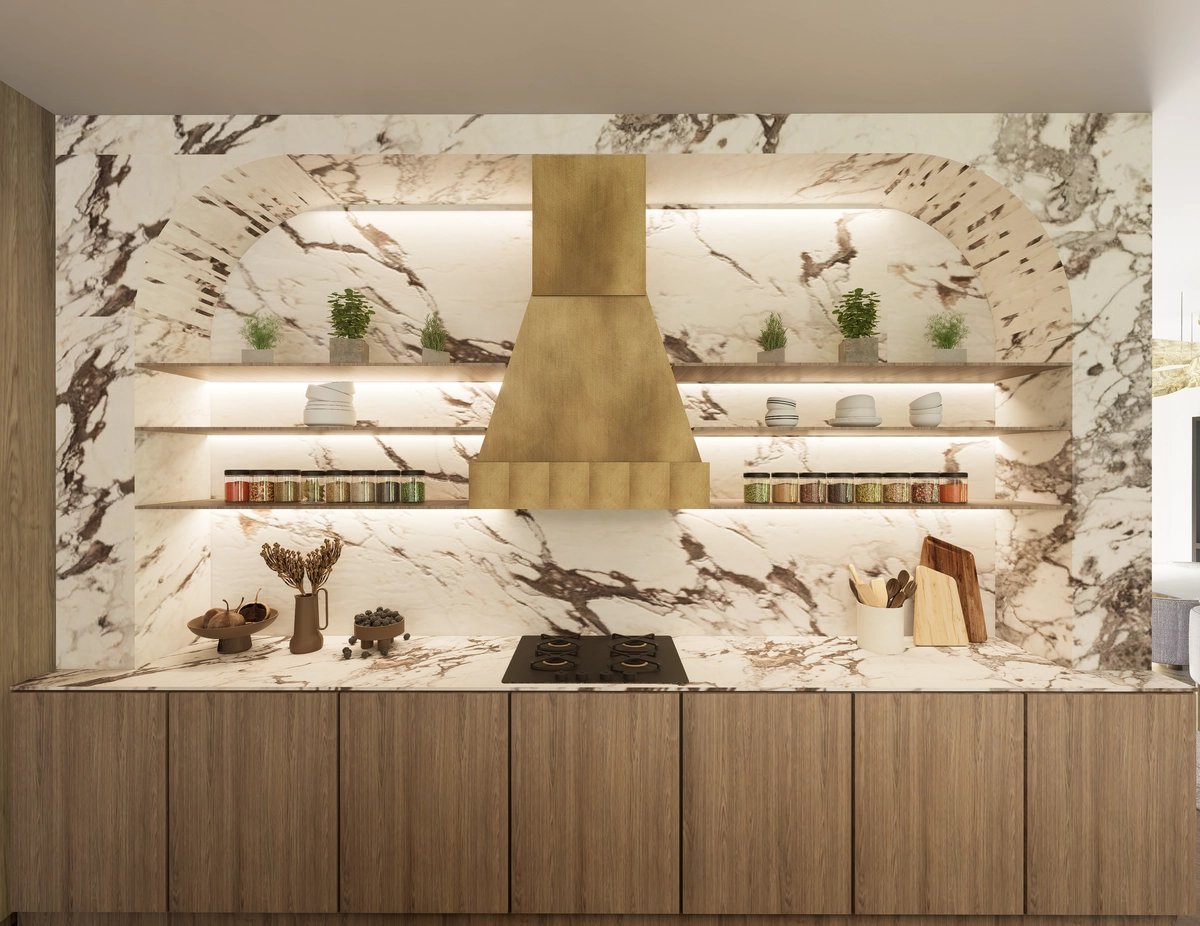 Kuhinja se razvija kroz dva karakterom različita, ali međusobno komplementarna segmenta. Tamni drveni volumeni unose osjećaj stabilnosti, dubine i topline, dok drugi dio prostora definira arhitektonski naglašen luk s policama obloženim bijelim mramorom s izraženim crnim žilama. Taj se motiv nastavlja kroz konzolni element i zid TV-a, stvarajući jasan materijalni kontinuitet koji povezuje različite zone u jedinstvenu priču.