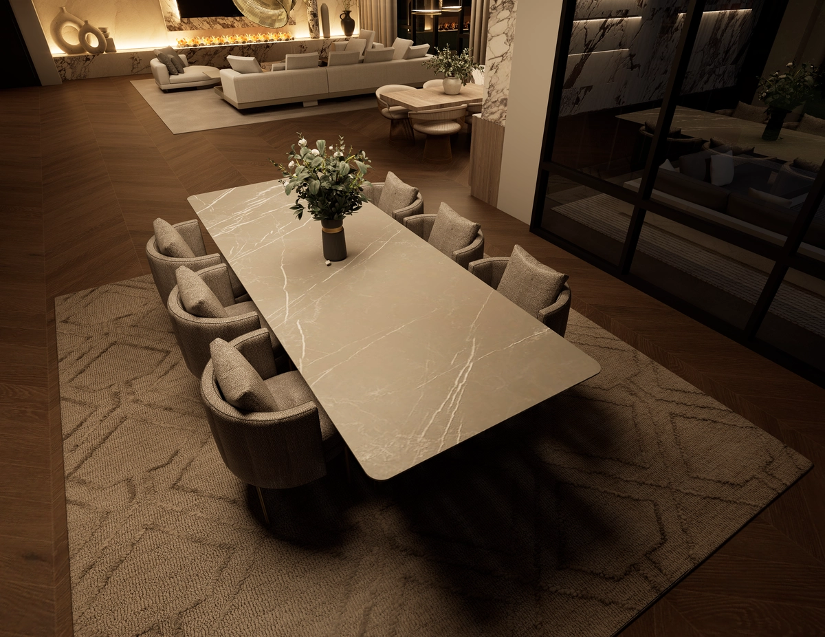 Svaki detalj u ovom interijeru pažljivo je pozicioniran - kao samostalni element, ali i kao dio šire kompozicije. Upravo kroz tu preciznu ravnotežu između sklada i suptilne napetosti nastaje prostor snažnog karaktera, visoke estetske vrijednosti i izražene, suvremene luksuznosti.