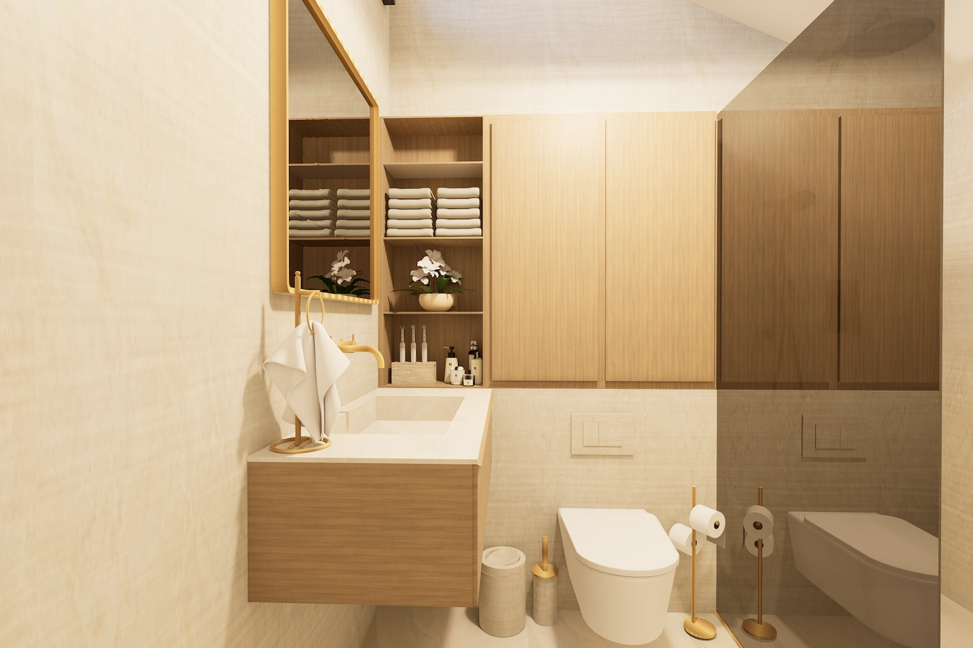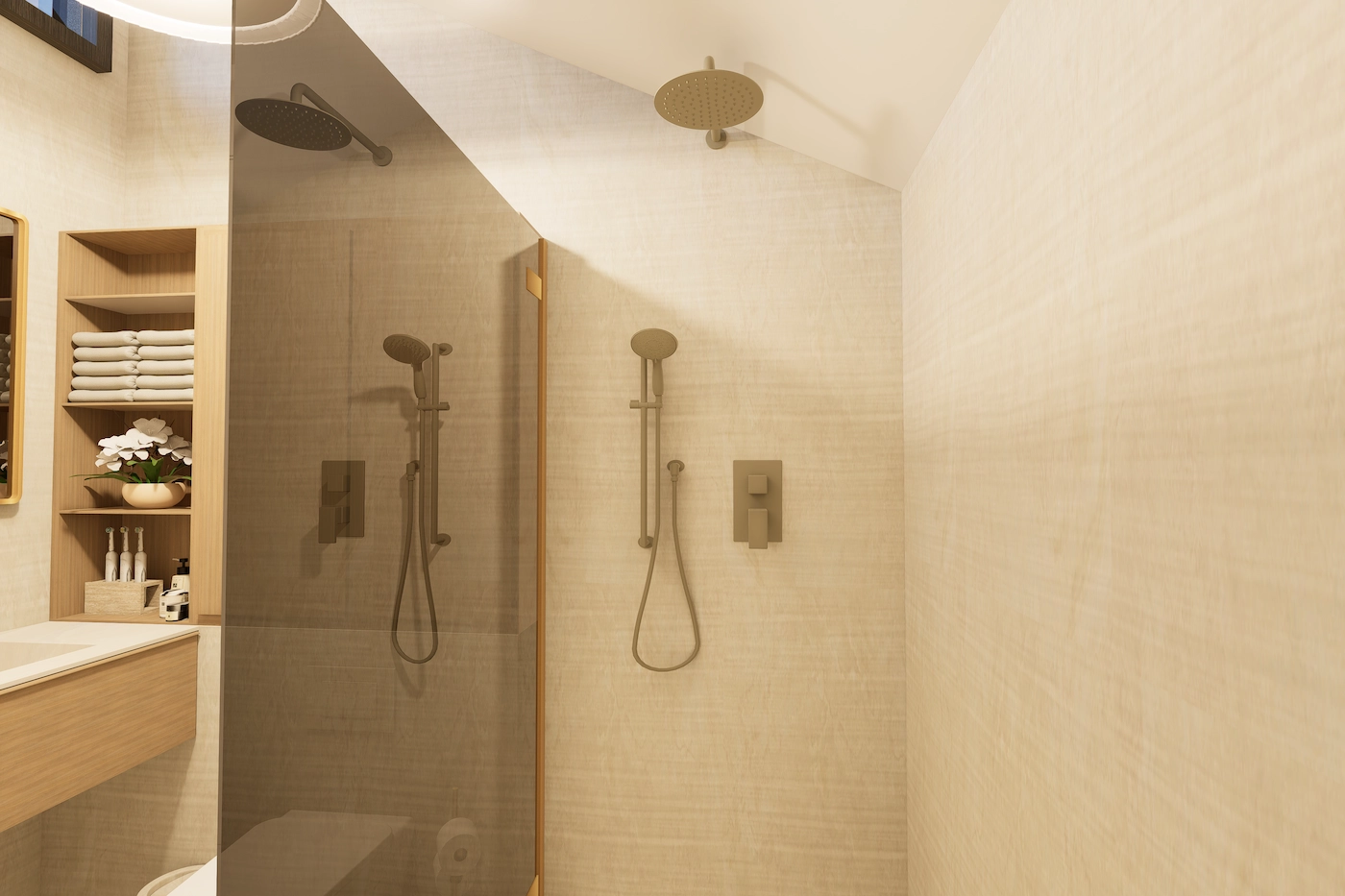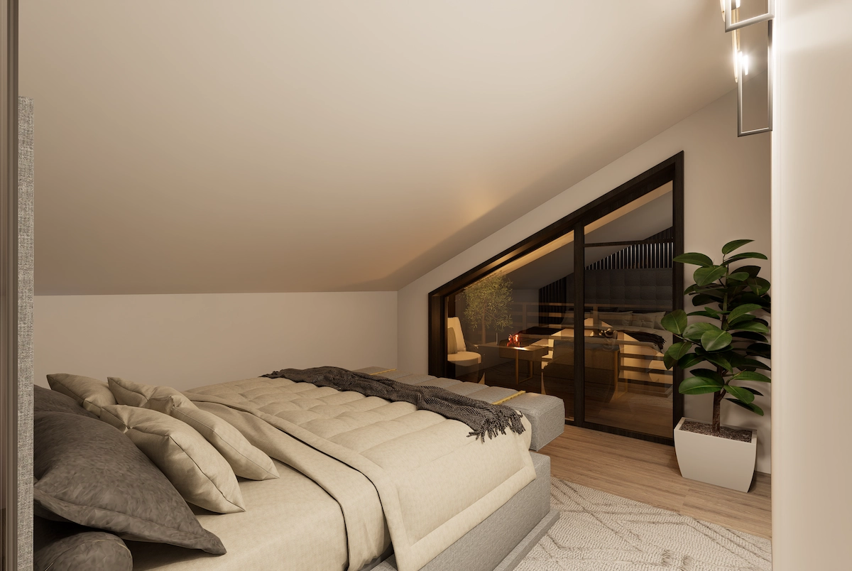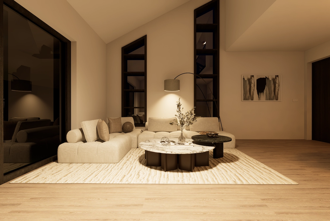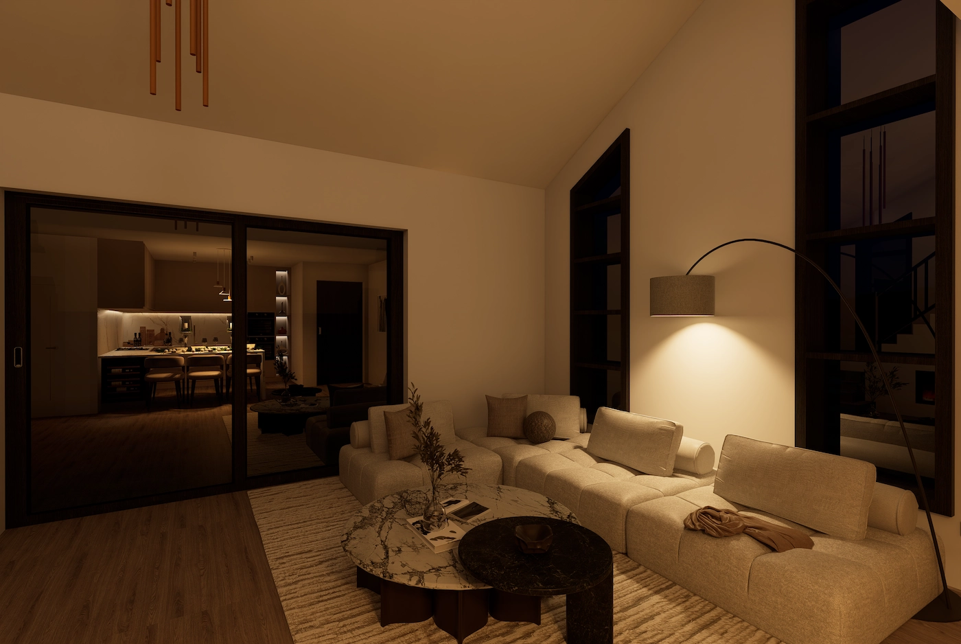 Neutralna paleta tkanina i materijala dodatno naglašava osjećaj prostornosti, dok se kroz tamne akcente u namještaju i dekorima unosi dubina i ritam u cjelokupnu kompoziciju prostora, spajajući besprijekoran dizajn i funkcionalnost.
