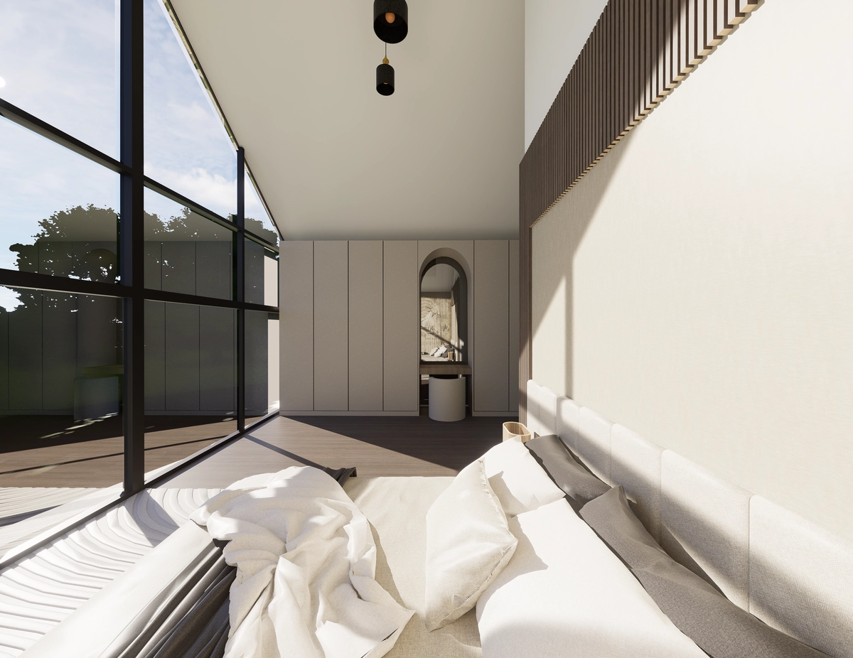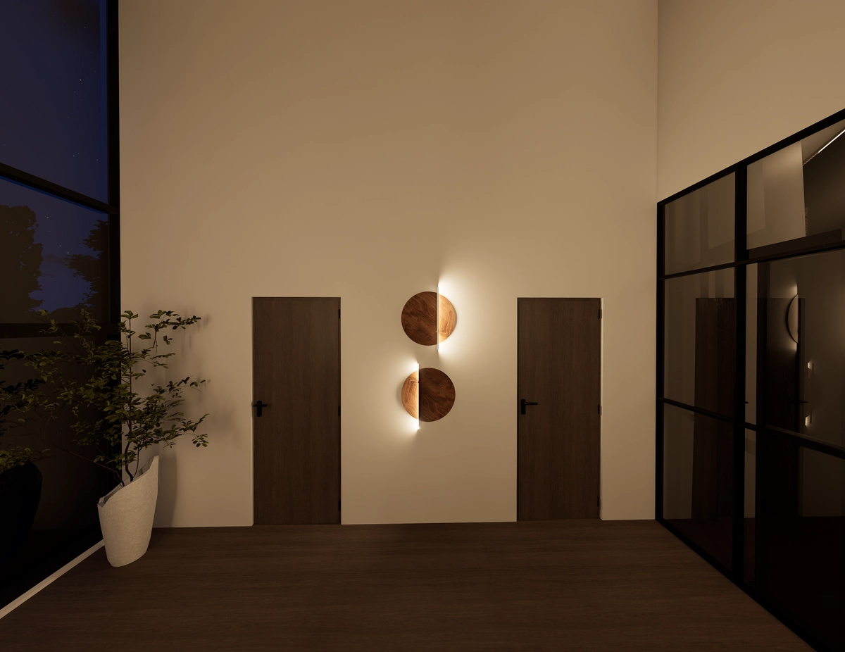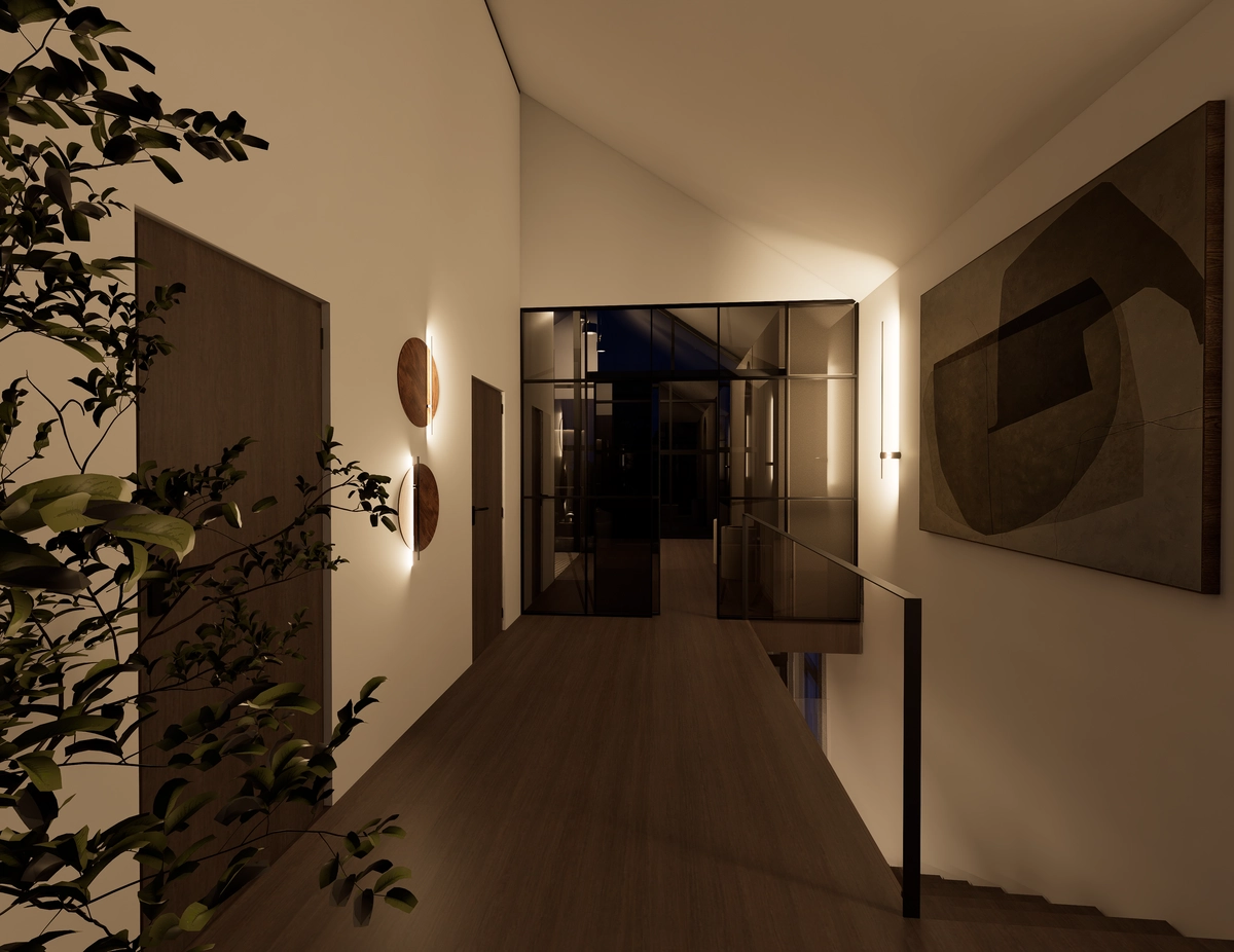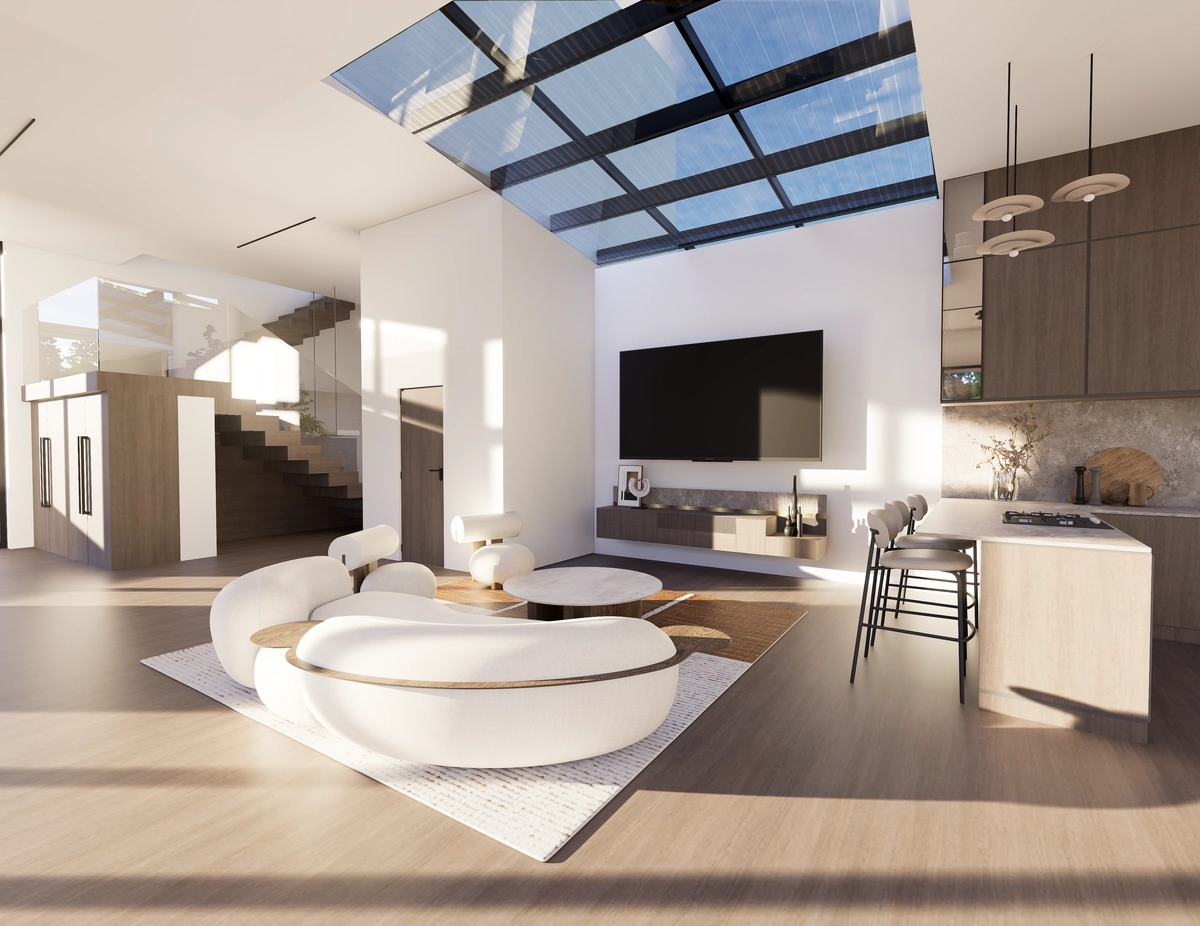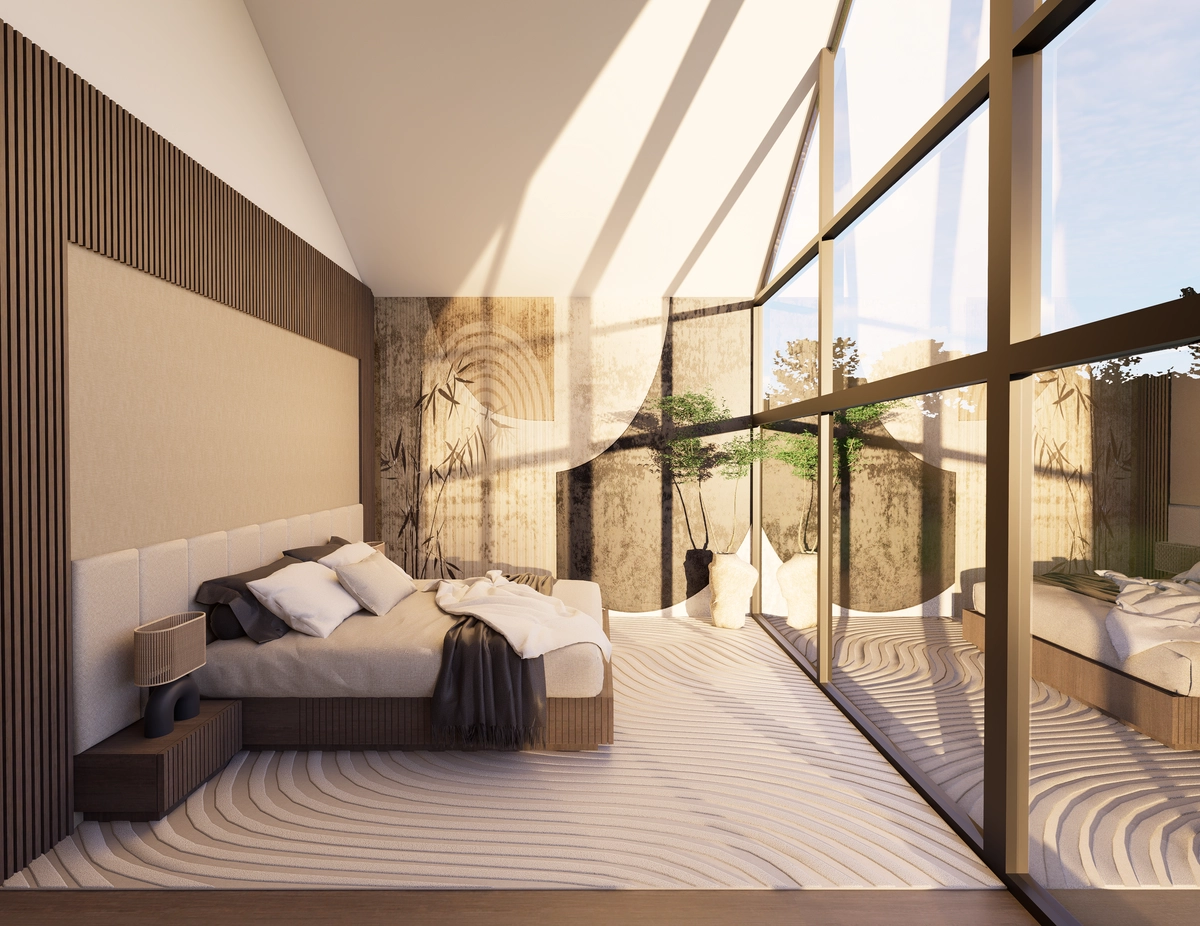 Dekor drva se kontinuirano proteže kroz svaku prostoriju i kroz svaki oblik - kao podne i zidne obloge, dekor namještaja i kao zidni paneli, na taj način stvarajući savršenu simbiozu između različitih životnih zona. Mnoštvo prirodne rasvjete kroz otvore punih visina dodatno doprinosi osjećaju čistoće i prozračnosti.