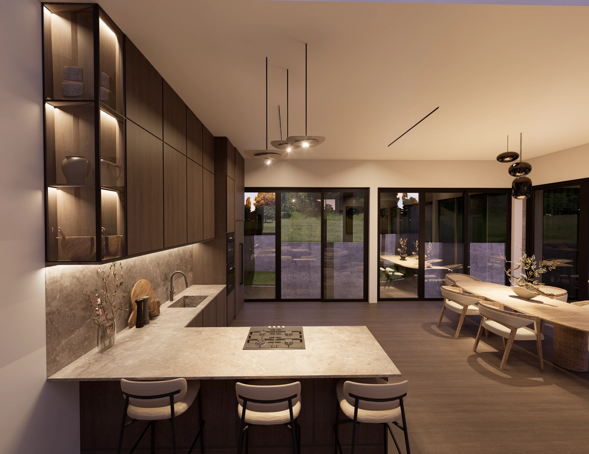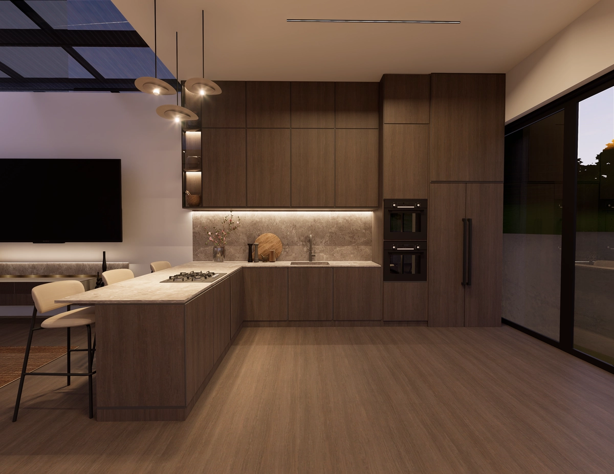 U dizajnu ovog prostora dominiraju tamno drvo i svijetli tonovi, koji donose kontrast u prostor, pritom doprinoseći osjećaju sklada. Kuhinja od poda do stropa, izrađena u toplom drvenom furniru, savršeno se nadopunjuje s drvenim blagovaonskim stolom i stolcima koji se suptilno nameću u prostoru, stavljajući naglasak na druženje i provođenje vremena zajedno.