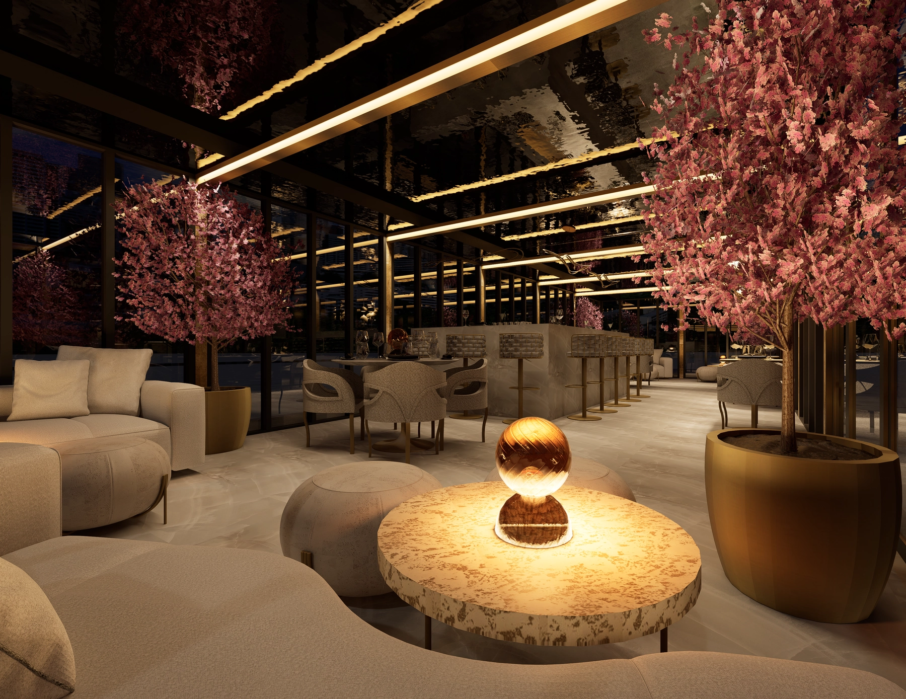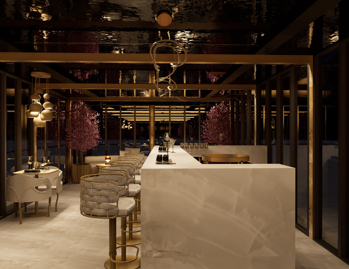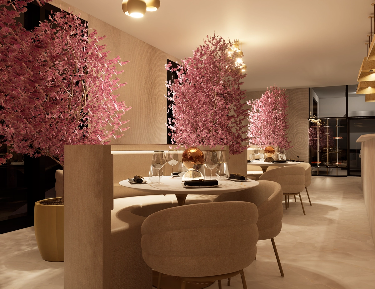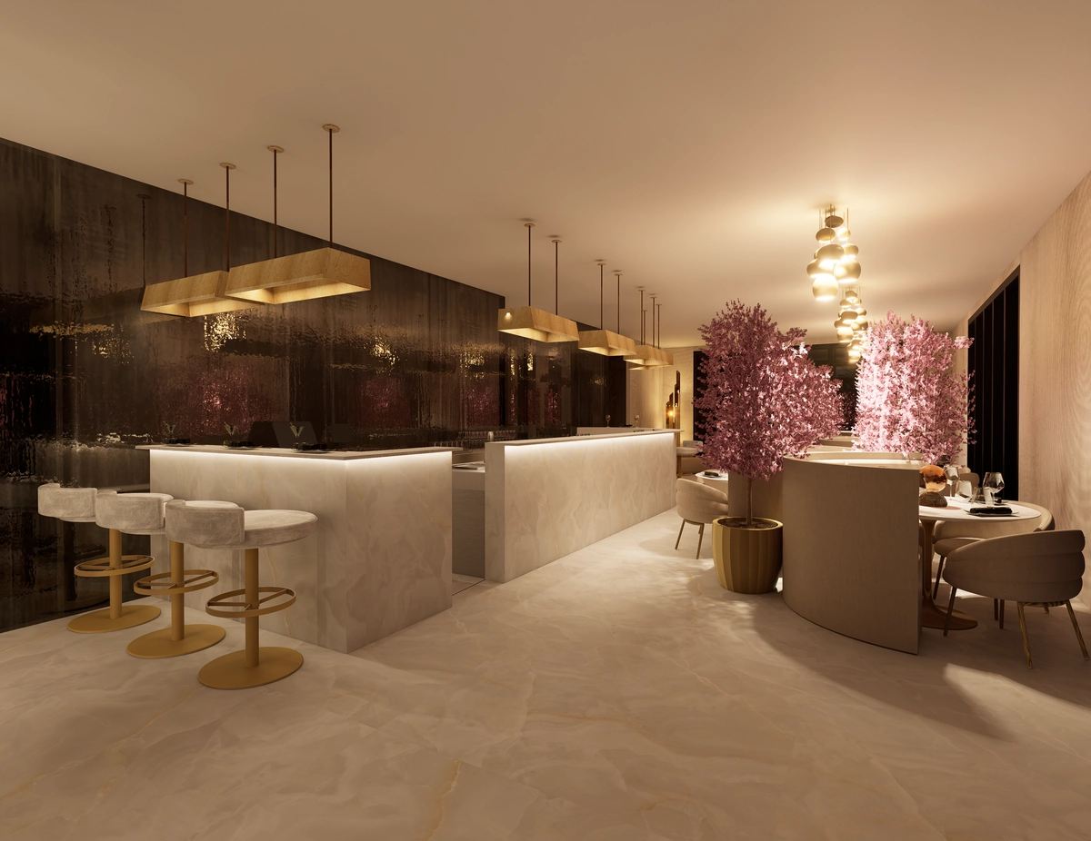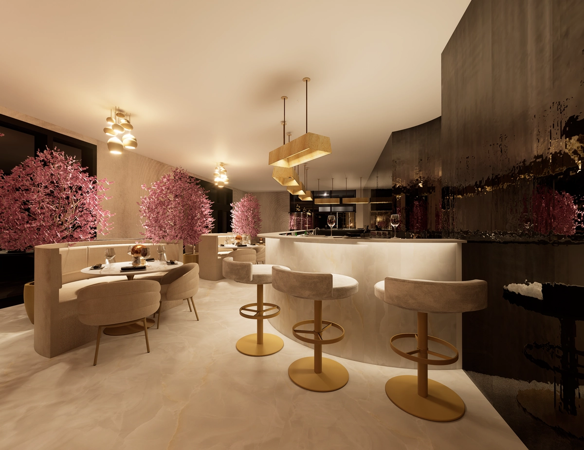 Interijer je osmišljen kao suptilna scenografija - mekane linije namještaja, topli kameni podovi i zlatni akcenti stvaraju osjećaj profinjene intime, dok raskošni cvjetni elementi unose dozu poetičnosti i vizualnog identiteta prostora.