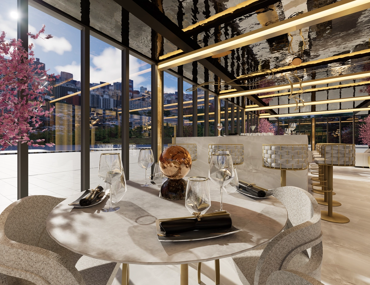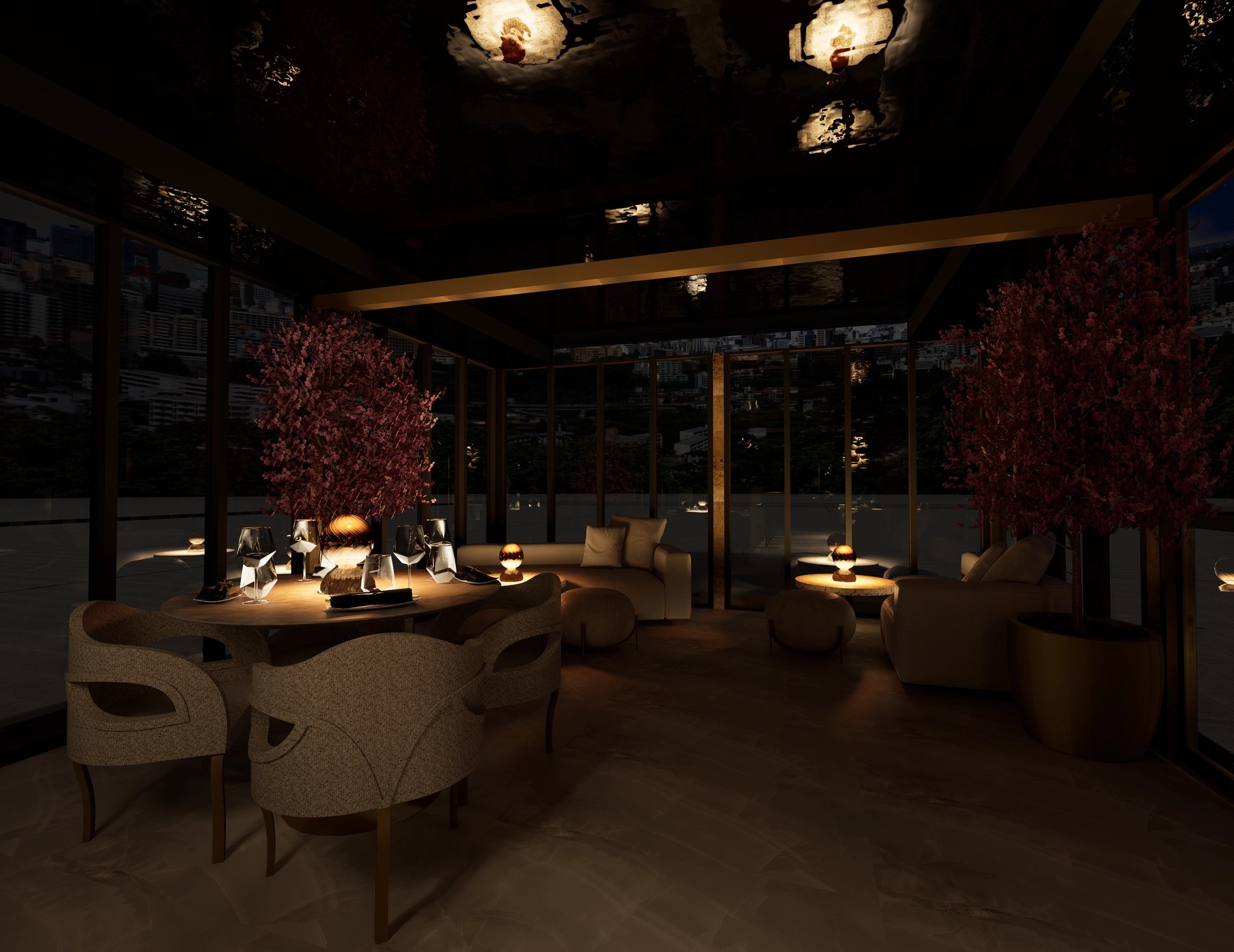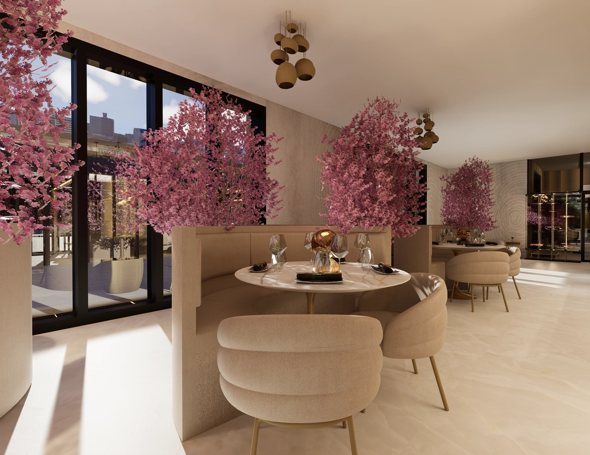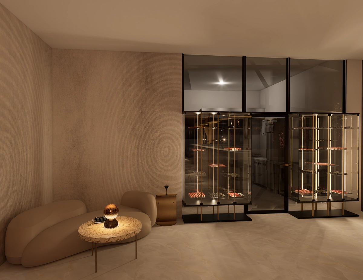 Interijer je osmišljen kao suptilna scenografija - mekane linije namještaja, topli kameni podovi i zlatni akcenti stvaraju osjećaj profinjene intime, dok raskošni cvjetni elementi unose dozu poetičnosti i vizualnog identiteta prostora.
