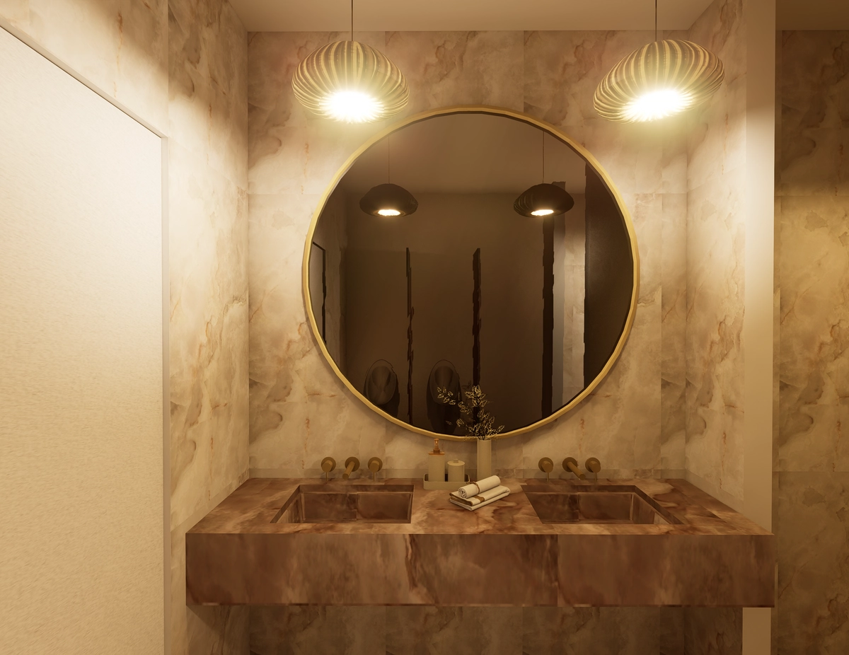 Rasvjeta je pažljivo modelirana kako bi naglasila teksture i refleksije, stvarajući atmosferu koja se mijenja s vremenom dana, ali uvijek zadržava osjećaj ugode i ekskluzivnosti.