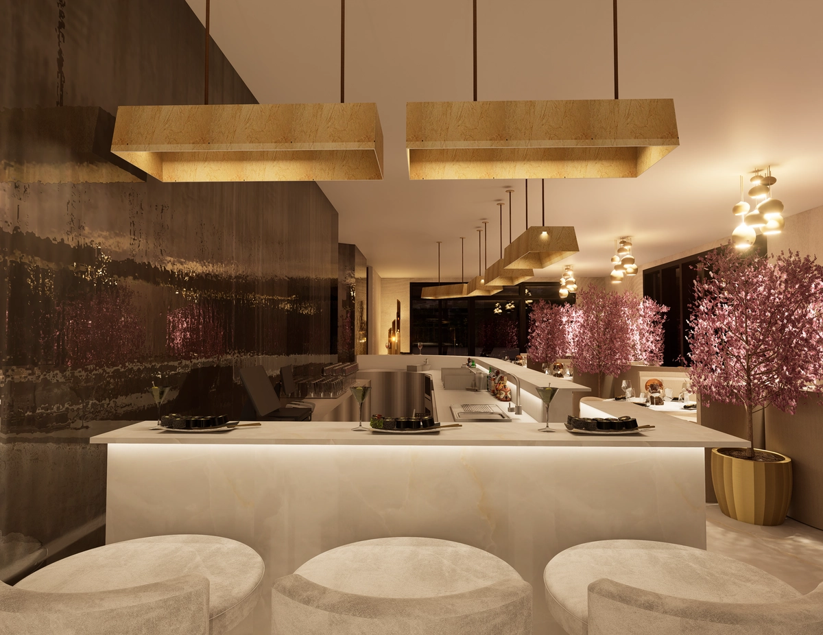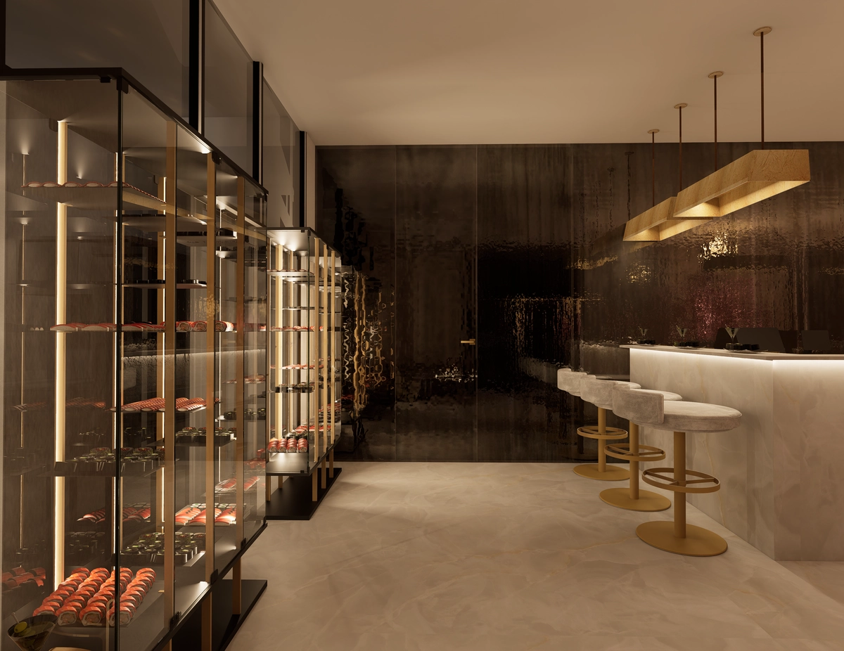 Zamišljen kao spoj elegancije i promišljenog dizajna, ovaj prostor stvara osjećaj tihog luksuza i hedonizma. Prirodni materijali i reflektivni elementi u prostoru potiču igru svjetlosti, dok pažljivo odabrani dizajnerski komadi naglašavaju njegov moderan karakter. U ovom sushi baru, svaki detalj oblikuje ambijent u kojem se uživanje u hrani pretvara u potpuno estetsko iskustvo.